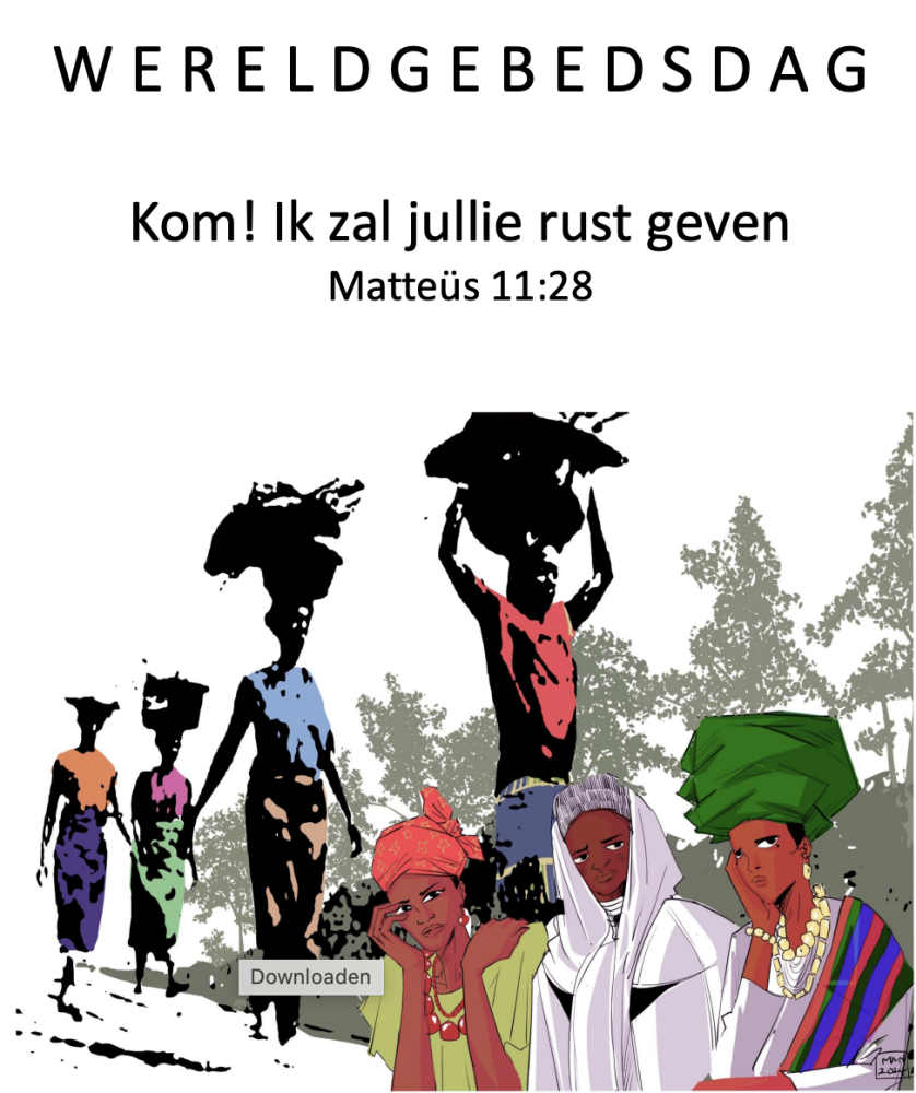 De organisatie van de Wereldgebedsdag is dit jaar in handen van een oecumenische groep vrouwen uit Nigeria. Ze roepen ons toe: Waar u ook bent in de wereld, kom tijdens de viering van Wereldgebedsdag samen en vind rust voor je ziel. We zijn verenigd in de liefdevolle omhelzing van Christus.